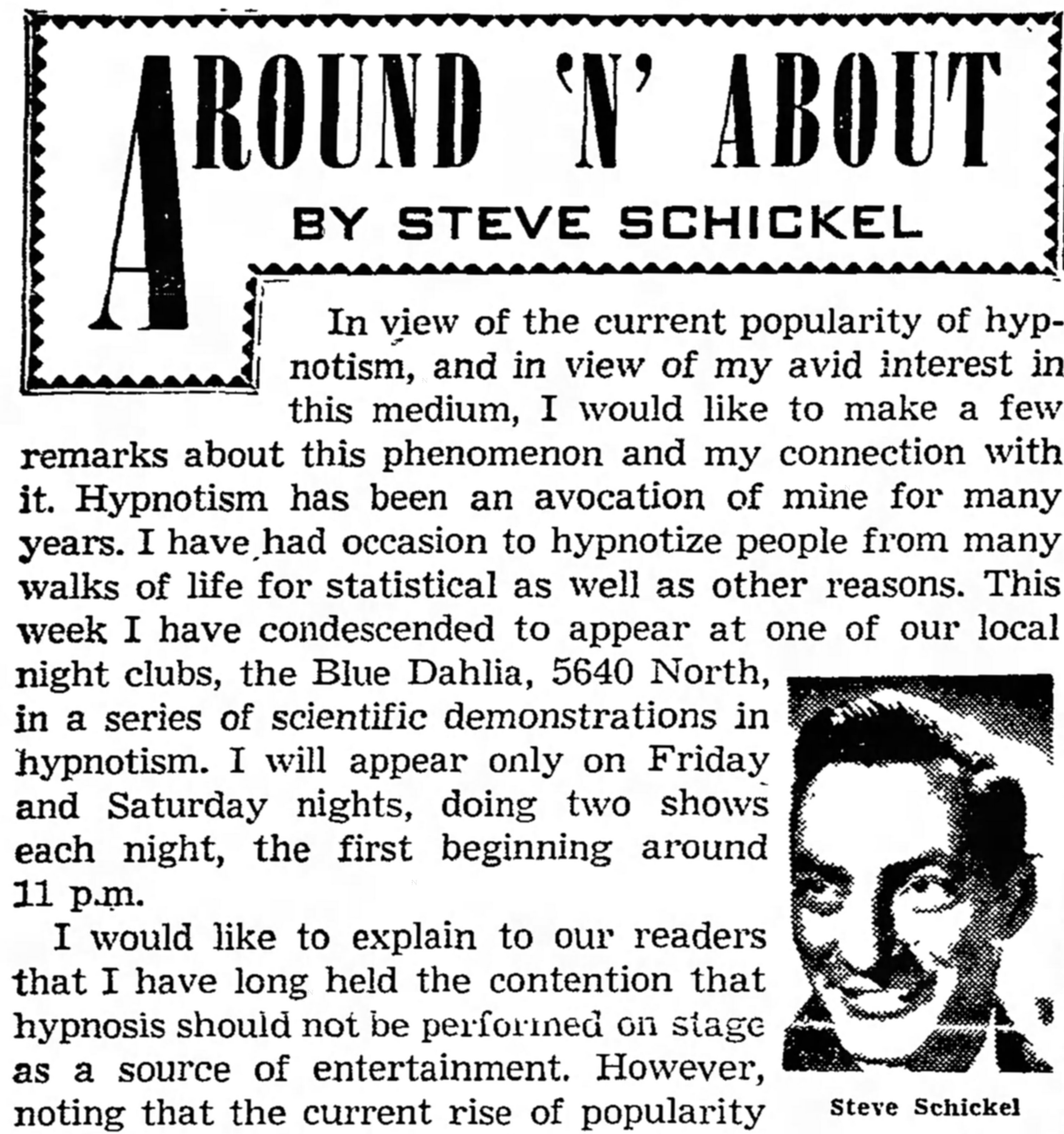 Around ‘N’ About, Steve Schickel, Hypnotism at the Blue Dahlia, September 16, 1959 April 27, 2018 / Pizza Hounds