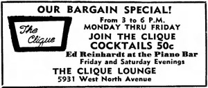 Ed Reinhardt at The Clique Lounge, 5931 W. North Ave. Source: Austin News, October 23, 1963. March 11, 2018March 13, 2018 / Pizza Hounds