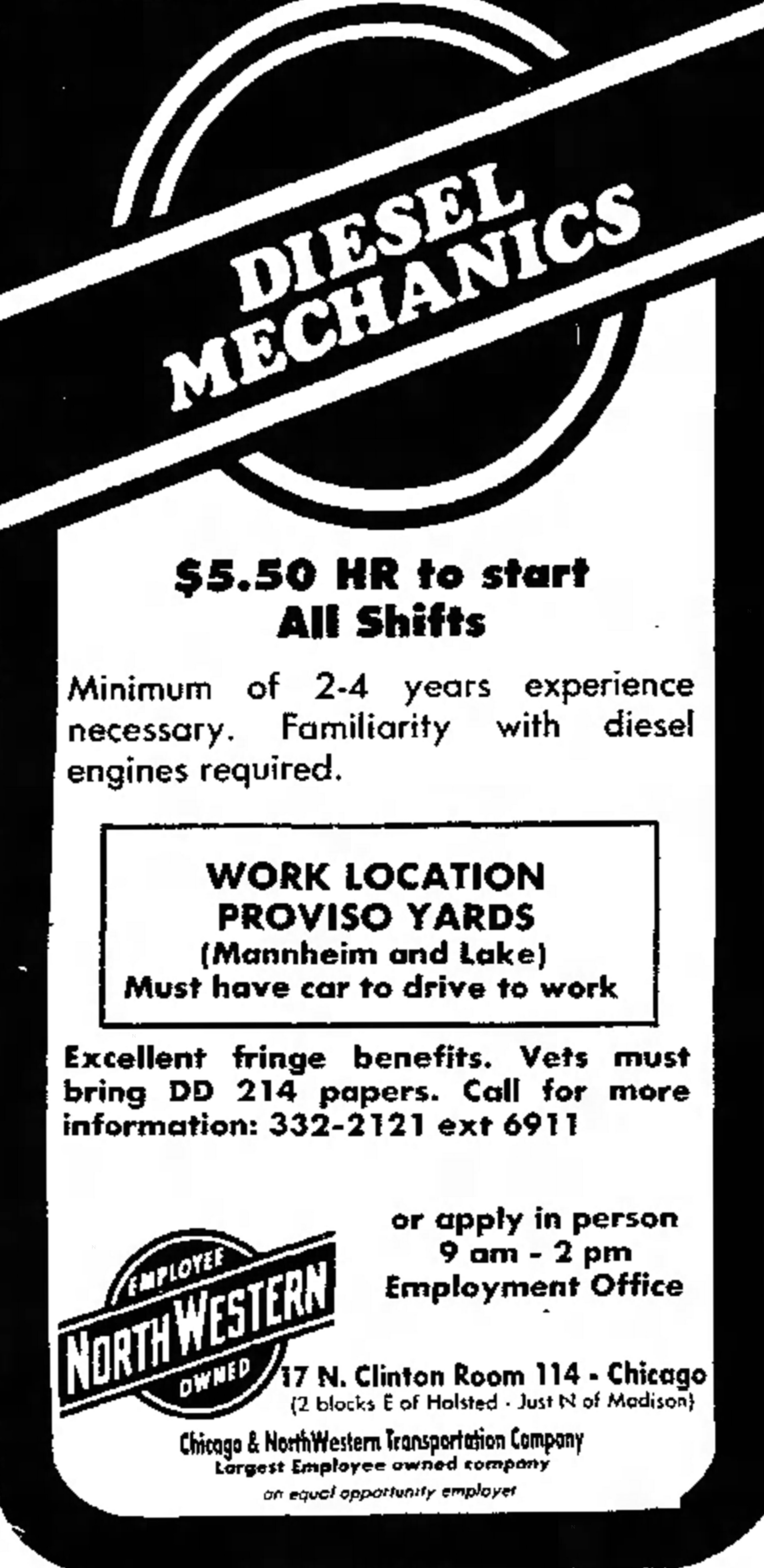 Diesel Mechanics at Proviso Yards, Chicago & North Western Transportation Co. – The News, January 9, 1974 February 11, 2018April 22, 2018 / Pizza Hounds