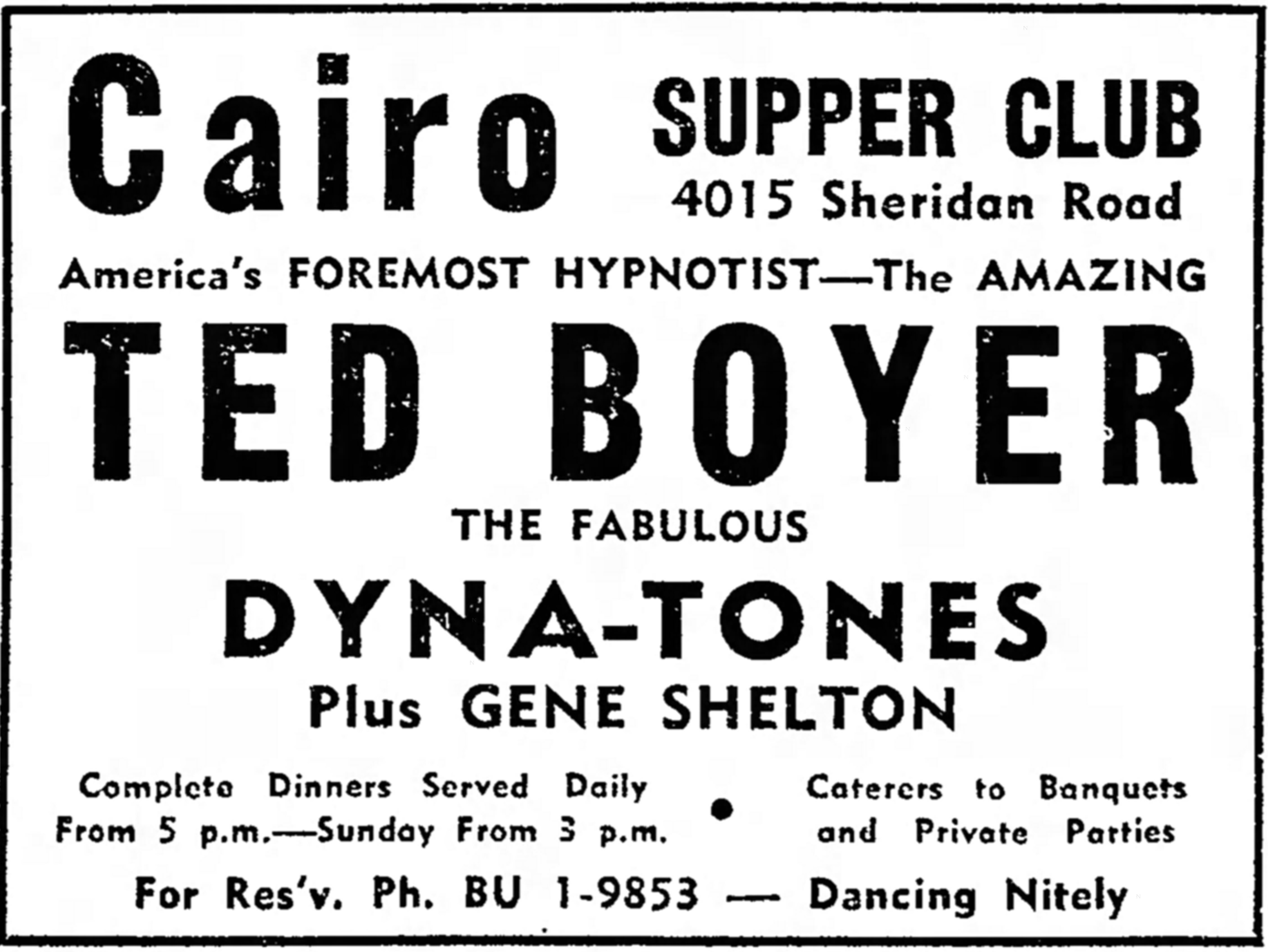 Ted Boyer, Dyna-Tones, Gene Shelton at Cairo Supper Club, 4015 Sheridan Road – The Garfieldian, January 29, 1958 March 11, 2018March 14, 2018 / Pizza Hounds