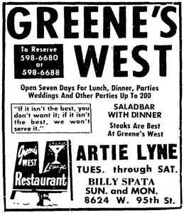 Artie Lyne, Billy Spata at Greene’s West, 8624 W. 95th St. – Suburbanite Economist, November 1, 1972 April 8, 2018April 27, 2018 / Pizza Hounds