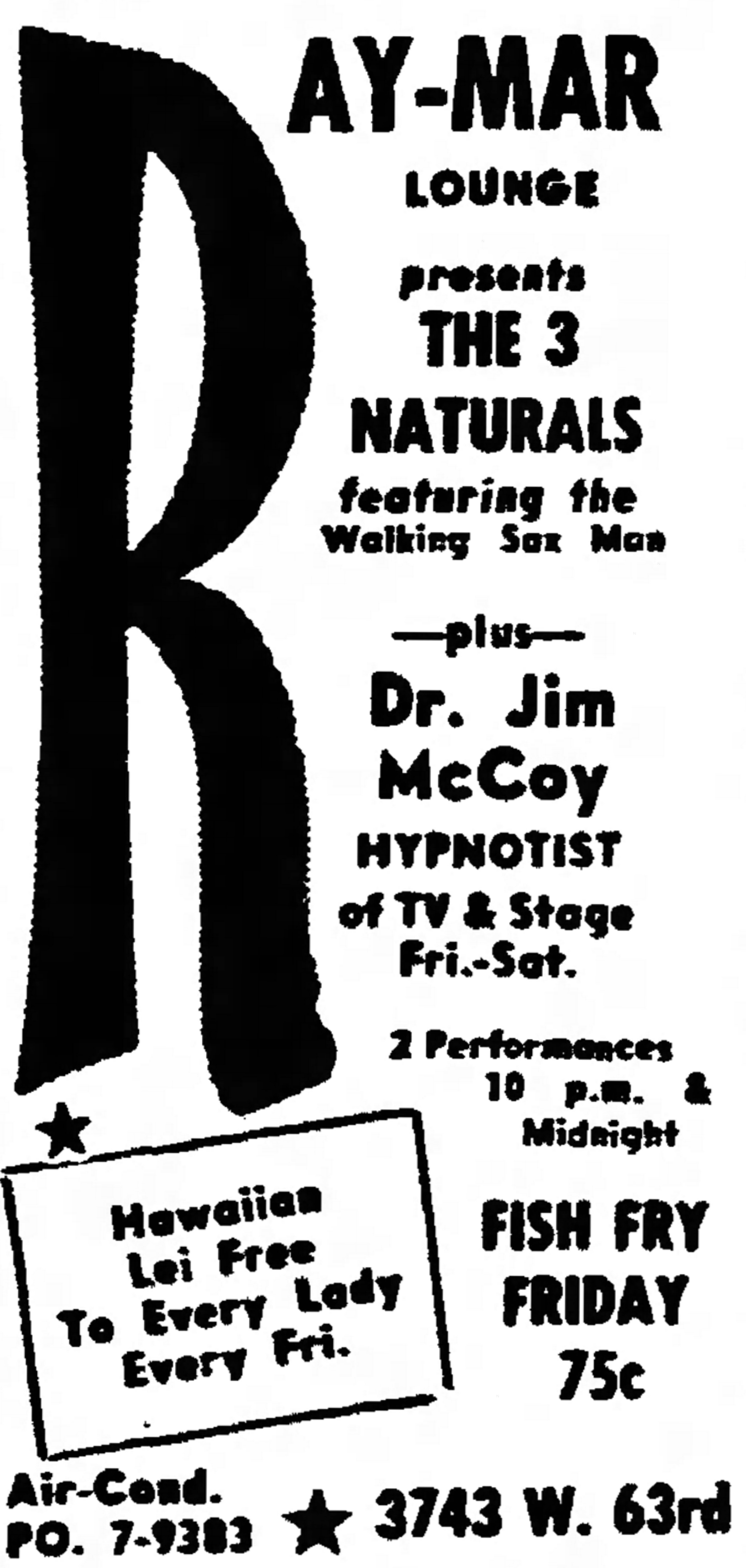 The 3 Naturals, Dr. Jim McCoy at Ray-Mar Lounge, 3743 W. 63rd – Southtown Economist, September 7, 1960 April 7, 2018April 27, 2018 / Pizza Hounds