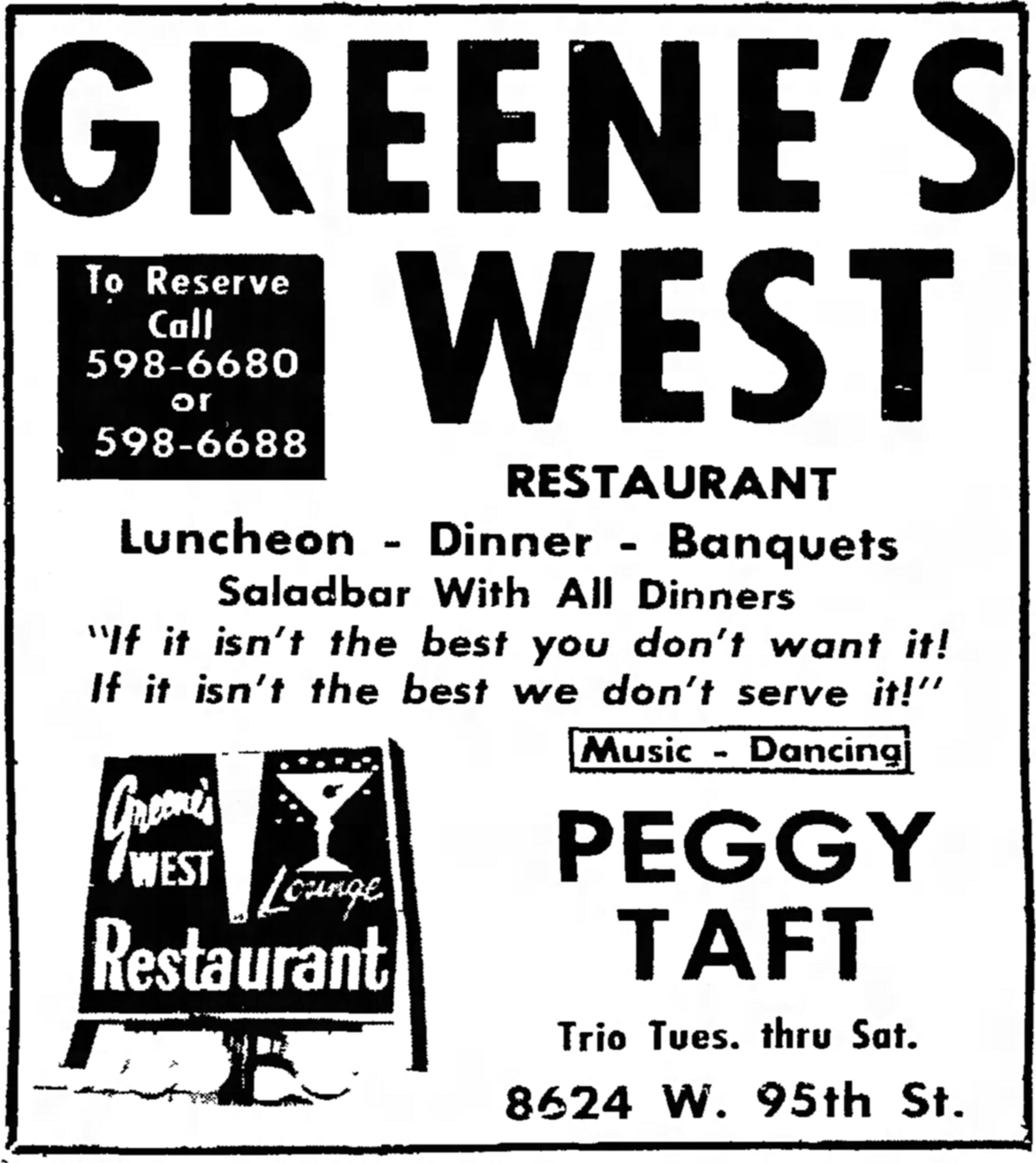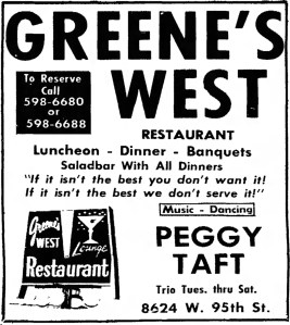 Peggy Taft at Greene’s West, 8624 W. 95th St. – Surburbanite Economist, July 21, 1971 April 19, 2018 / Pizza Hounds