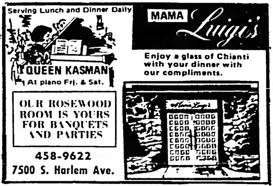 Queen Kasman at Mama Luigi’s, 7500 S. Harlem Ave. – The Garfieldian, June 28, 1972 March 11, 2018March 16, 2018 / Pizza Hounds