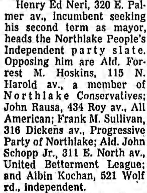 Northlake Mayoral Candidates, including Henry Neri and Frank M. Sullivan – Chicago Tribune, March 9, 1961 April 27, 2018April 27, 2018 / Pizza Hounds