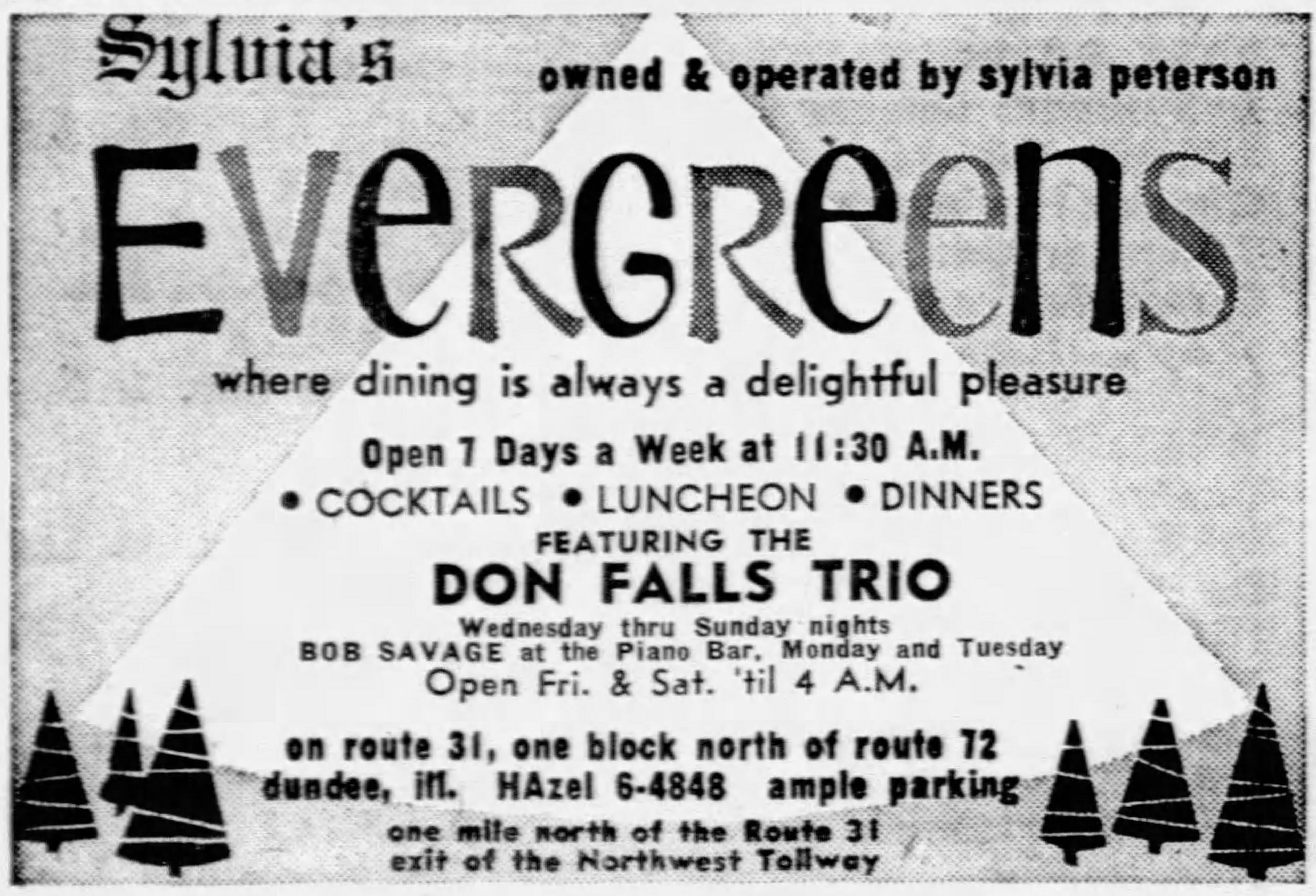 Sylvia Peterson’s Evergreens, Route 31 one block north of Route 72, Dundee, Illinois, featuring the Don Falls Trio, Bob Savage – Chicago Tribune, October 7, 1965 March 31, 2018March 31, 2018 / Pizza Hounds