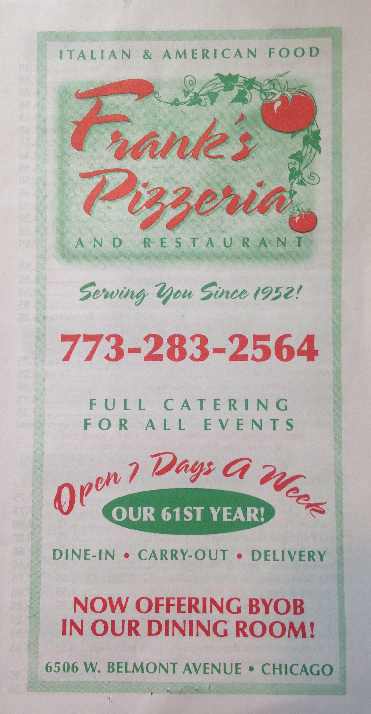 Frank’s Pizzeria is located at 6506 W. Belmont Ave. in Chicago
